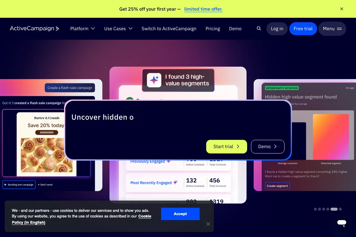 ActiveCampaign tarjoaa yrityksille poikkeuksellisen tehokkaan alustan markkinoinnin, myynnin ja asiakaskokemuksen automatisointiin. Sen ytimessä on edistynyt Active Intelligence -tekoälyorkestrointi, joka on suunniteltu erityisesti SaaS-yritysten, verkkokauppojen, terveydenhuollon, koulutusalan ja markkinointitoimistojen vaativiin strategisiin tarpeisiin.