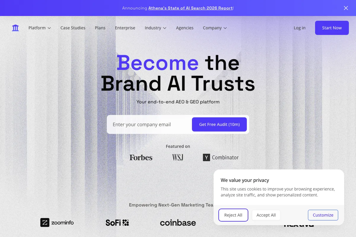 AthenaHQ on enterprise-tason työkalu CMO:ille sekä SEO- ja GEO-asiantuntijoille, jotka haluavat mitata brändinsä aseman tekoälymallien antamissa vastauksissa. Alusta tarjoaa ylivoimaisen datanäkymän SaaS-yritysten ja verkkokauppojen digitaaliseen jalanjälkeen.