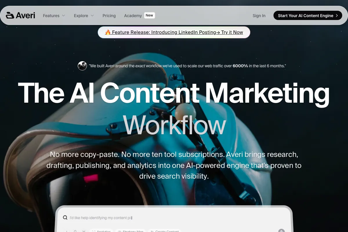 Averi mullistaa sisällöntuotannon yhdistämällä datavetoisen strategian ja tekoälyn tehokkuuden. Tämä alusta on suunniteltu startup-perustajille ja sisältömarkkinoijille, jotka haluavat saavuttaa poikkeuksellista orgaanisen liikenteen kasvua ilman valtavaa manuaalista työtä.